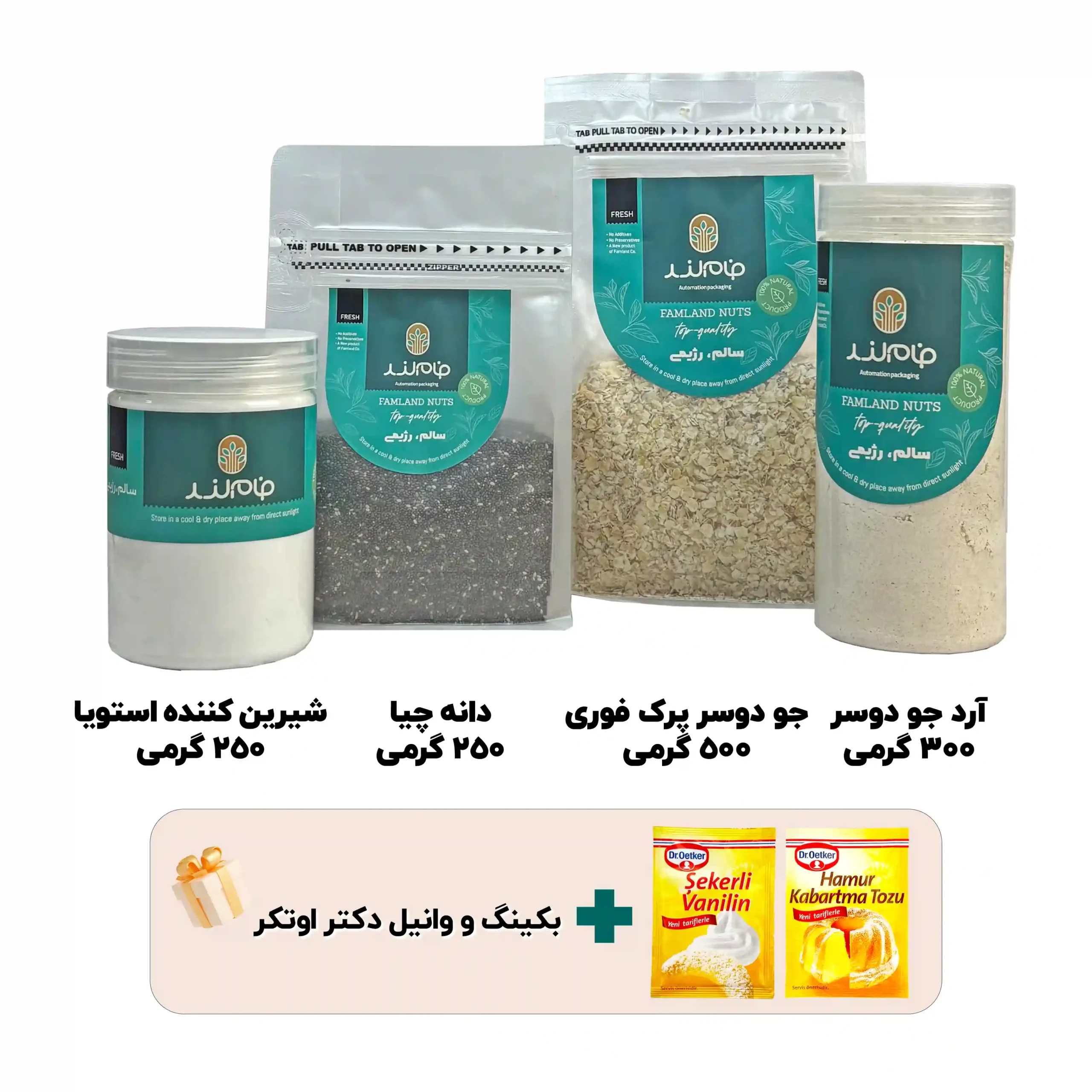 پکیج تناسب و تعادل فاملند شامل آرد جو دوسر، جو دوسر پرک فوری، دانه چیا و شیرینکننده استویا؛ یک پکیج سلامتی کامل برای رژیم محصولات سالم رژیمی، کنترل وزن و انرژی پایدار.