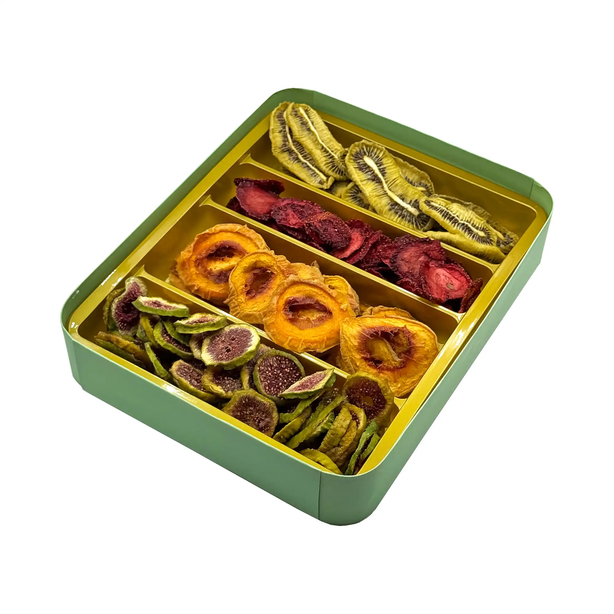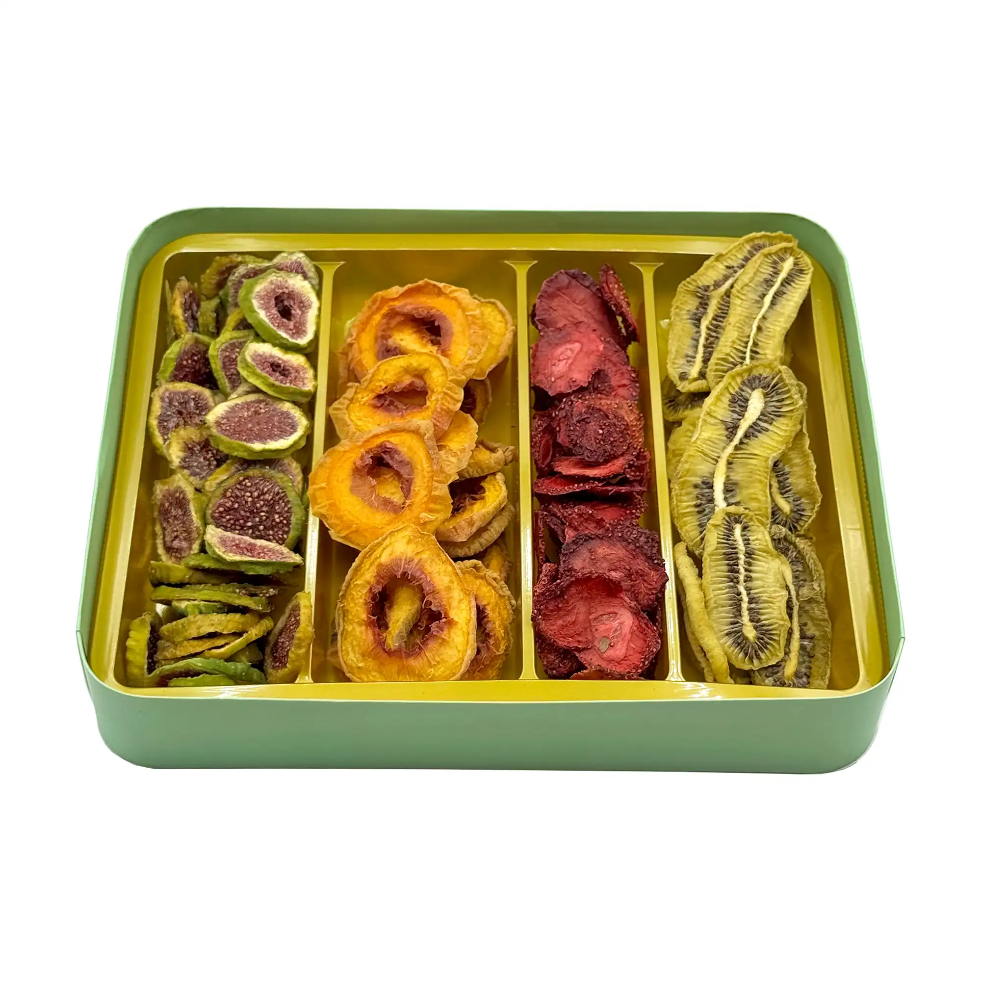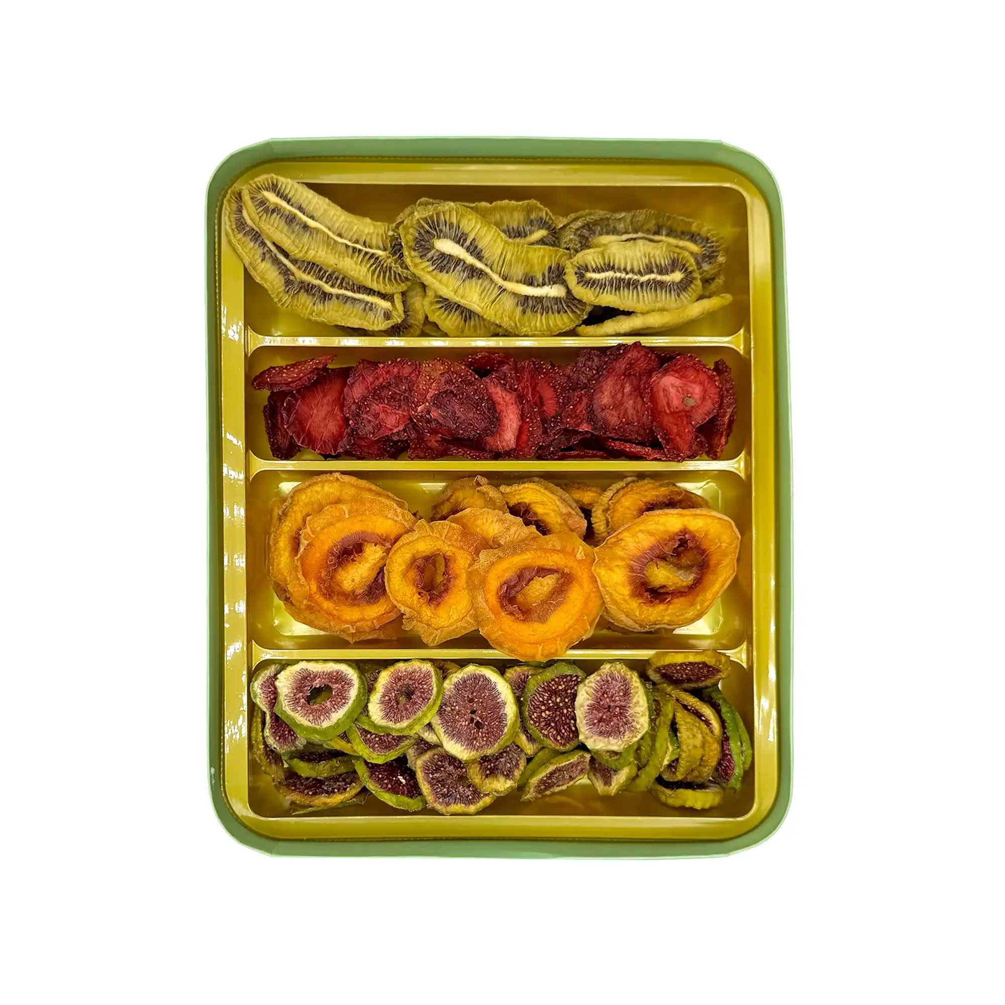 این جعبه حاوی 35 گرم توت فرنگی اسلایس خشک، 70 گرم انجیر اسلایس خشک، 60 گرم کیوی اسلایس خشک و 60 گرم هلو زعفرانی اسلایس خشک می باشد.